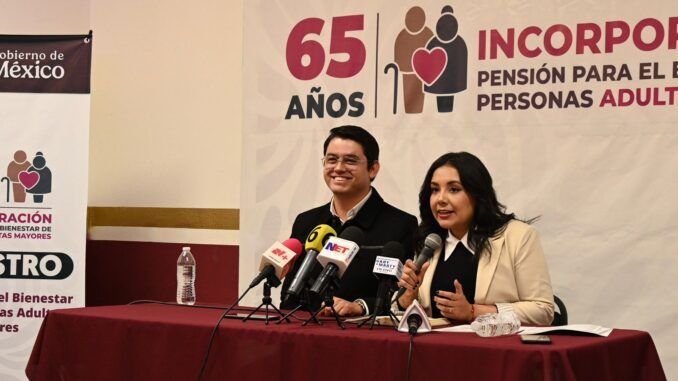 Chihuahua.- En la conferencia de medios presidida por la delegada de los Programas de Bienestar en Chihuahua, Mayra Chávez Jiménez y por Omar Hellem García Palomares, director regional en Ciudad Juárez, se informó que del 19 al 30 de noviembre se realizará el registro de incorporación a la Pensión para el Bienestar de las Personas Adultas Mayores para quienes cumplieron o cumplen 65 años o más al 31 de diciembre de 2024.