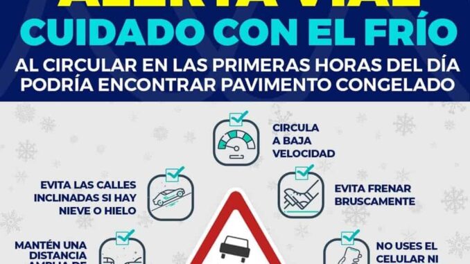 Chihuahua .- El Gobierno Municipal de Chihuahua a través de la Coordinación Municipal de Protección Civil, informa que para el día lunes por la mañana existe la probabilidad de precipitaciones de nieve o aguanieve, por lo que exhorta a la ciudadanía a conducir con precaución ante un congelamiento del pavimento.