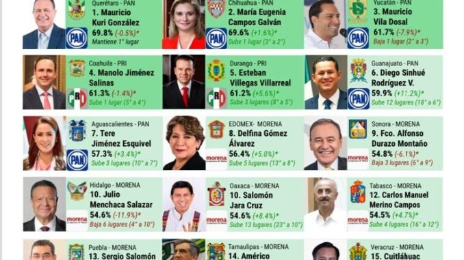 El Top 5 de los gobernadores mejor evaluados lo encabeza Mauricio Kuri, de Querétaro; en tercer sitio se ubica Mauricio Vila, de Yucatán; le sigue Manolo Jiménez, de Coahuila y Esteban Villegas, de Durango.