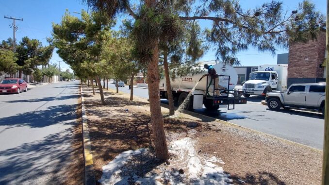 Juárez.- La Dirección General de Servicios Públicos dio a conocer que diariamente trabajan con las 10 pipas cargadas con agua tratada, en la atención de camellones y parques públicos en distintos puntos de la ciudad, con el fin de darle un riego suficiente a la vegetación que está plantada en estos espacios.