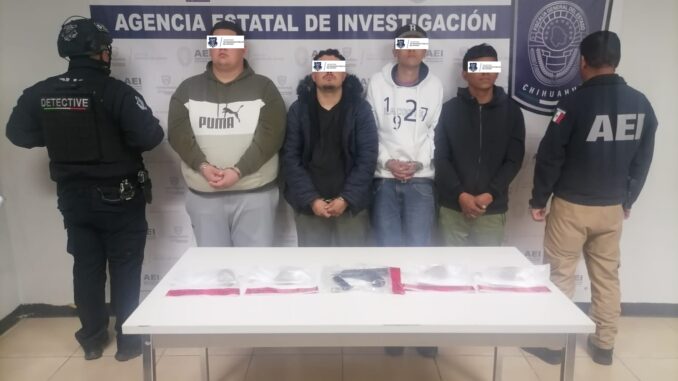 Juárez.- Elementos de la Agencia Estatal de Investigación (AEI) y de la Secretaría de Seguridad Pública del Estado (SSPE), detuvieron en flagrancia a un grupo de 4 sujetos por portación ilegal de armas de fuego y delitos contra la salud.