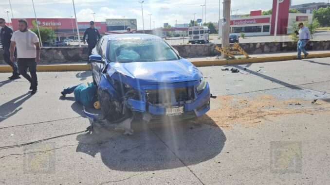 Chihuahua.- Un fuerte accidente vial se registró la tarde de este domingo en la lateral del Periférico, en dirección de Sur a Norte, a la altura de la avenida Francisco Villa. Un automóvil Honda Civic terminó volcado después de que su conductor perdiera el control y se estrellara contra un poste de la Comisión Federal de Electricidad.
