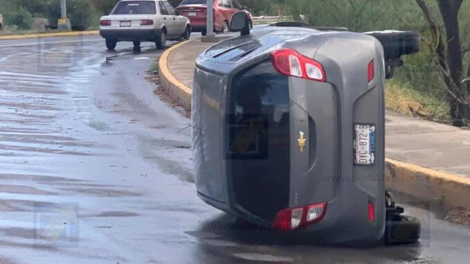 Chihuahua.- Una mujer que manejaba un Chevrolet Beat gris volcó su vehículo la tarde de este viernes luego de impactar contra el cordón de la banqueta cuando intentaba incorporarse de la avenida Fuerza Aérea hacia la diagonal Juan Pablo II.
