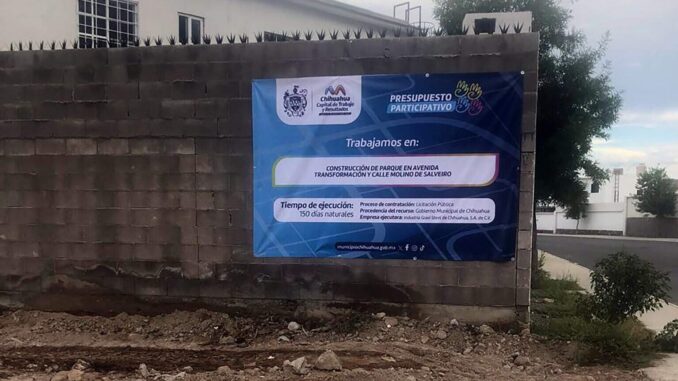 Chihuahua .- A través del  Presupuesto Participativo del Gobierno Municipal, será construido un parque en lo que es un terreno baldío ubicado en las calles avenida Transformación y Molino Salveiro, proyecto promovido por Armonía Perales, que junto con sus vecinos hicieron una exhaustiva promoción para resultar ganadores.