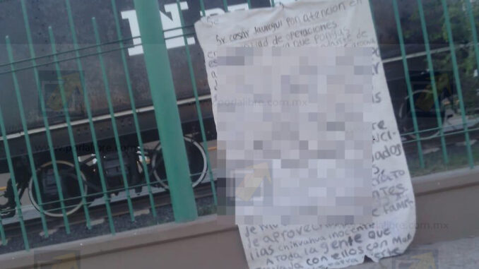 Chihuahua.- La mañana de este lunes fue localizada una manta con un mensaje amenazante en la colonia Pacífico, colocada sobre la reja de acceso principal de la empresa Ferromex, a la altura del cruce de las calles Méndez y 26, al sur de la ciudad.