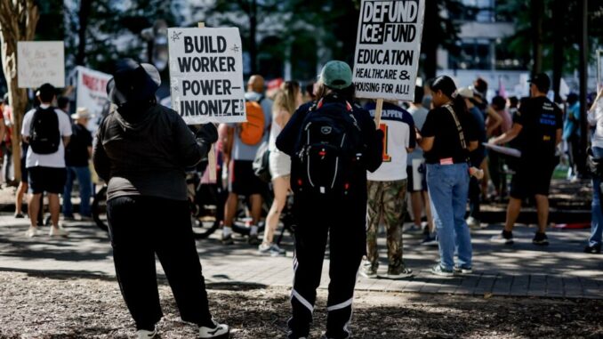 La Federación Estadounidense del Trabajo y Congreso de Organizaciones Industriales convocó más de mil protestas por todo el país, especialmente en los estados demócratas de California, Nueva York e Illinois, bajo el lema ‘Los trabajadores por encima de los multimillonarios”.