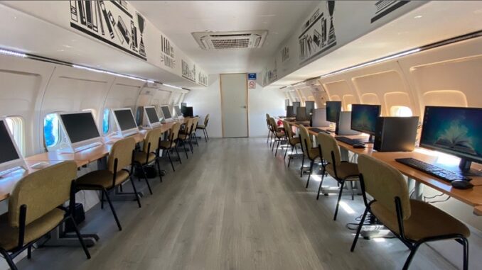 El Biblioavión es un espacio de aprendizaje, pero sobre todo un lugar donde los niños pueden interactuar de manera virtual, además de aprender de forma lúdica.