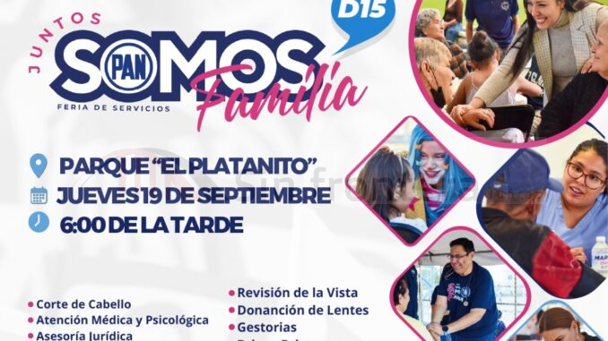 Chihuahua, Chih.- Mañana, jueves 19 de septiembre, la diputada local por el Partido Acción Nacional (PAN), representante del Distrito XV, Joss Vega, en colaboración con el Comité Directivo Municipal del PAN y su presidenta, Sarahí Franklyn, llevará a cabo una feria de servicios en la colonia Infonavit Nacional, bajo el lema “Juntos Somos Familia”. El evento se realizará en el parque “El Platanito” a partir de las 6:00 p.m.