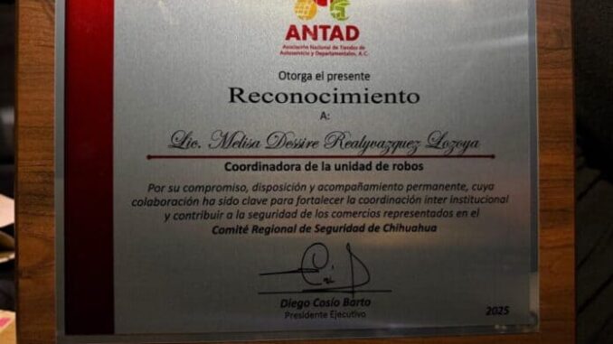 En el marco de la reunión mensual entre la Unidad Especializada en Investigación de Delitos de Robo de la Fiscalía de Distrito Zona Centro y la Asociación Nacional de Tiendas de Autoservicio y Departamentales (ANTAD), se entregó un reconocimiento especial a la coordinadora Melisa Dessire Realivazquez Lozoya.
