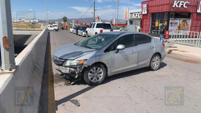 Chihuahua.- Un accidente inusual se registró en el estacionamiento en la tienda alsúper ubicada en la intersección de la carretera Aldama y la avenida Club de Leones, cuando el conductor de un automóvil Honda Civic, color gris, perdió el control de la unidad y se estrelló contra una baranda metálica junto al establecimiento de comida rápida Kentucky.