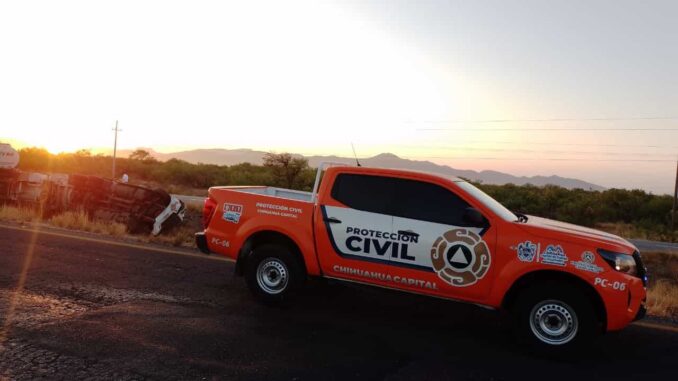 Chihuahua.- – La Coordinación Municipal de Protección Civil, trabaja en estos momentos en la atención de la volcadura de una pipa de combustible que se presentó durante esta mañana en la carretera Chihuahua – Juárez, en el kilómetro 105.